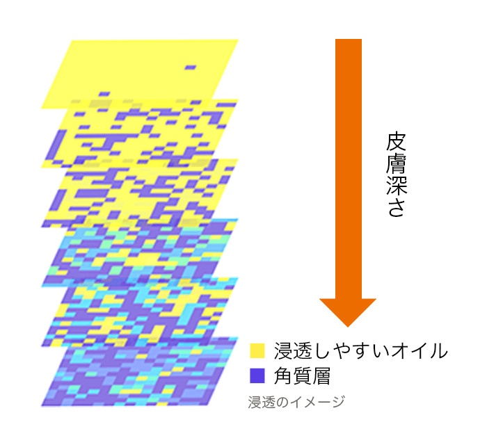 浸透しやすいオイルは、肌との親和性が高いため肌になじみやすく、角質層の深部まですーっと浸透します。 右図は、角質層のイメージ図です。黄色部分がオイルが浸透している部位を示しています。 このような角質層深部まで浸透しやすいオイルは、角質層を柔らかくして、肌をしっかりと保湿してくれます。