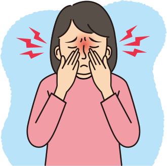 - グーッと押されるような痛みです。炎症が強い場合は、目の周囲が腫れたり視力に影響することもあります。眼科疾患では鼻水や鼻づまりを伴うことは少なく、副鼻腔炎では鼻の症状と連動して痛む点が特徴です。