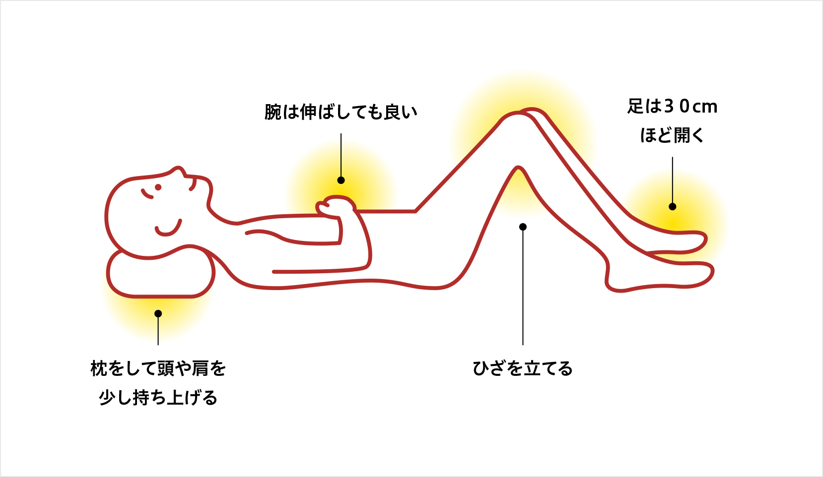 - 枕に頭をつけて仰向けになり、全身をリラックスさせます。