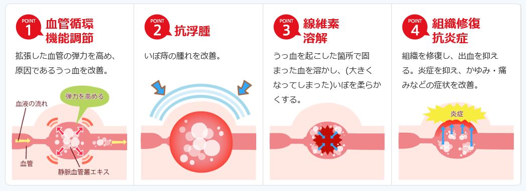 5つの薬理作用が症状を緩和しながら、いぼ痔を小さくしていきます。