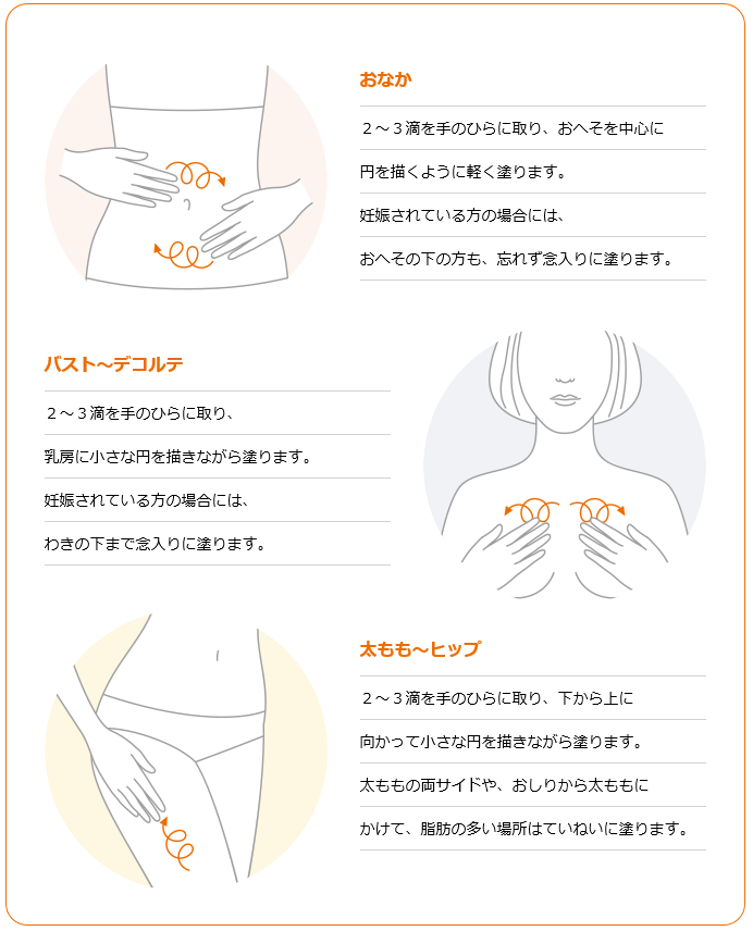 入浴後などの清潔な肌に、円を描くように軽くマッサージしながらなじむまで塗ってください。