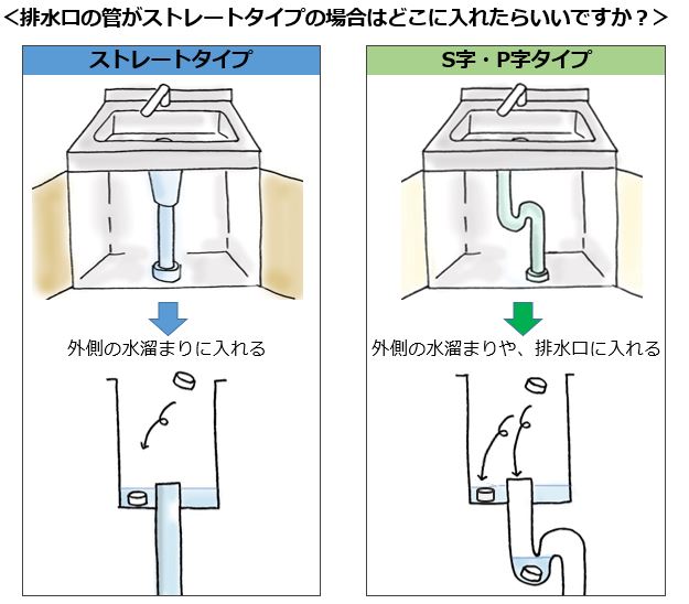 排水口の管がS字ではなく、ストレートのタイプですが、どこに入れたら良いか?